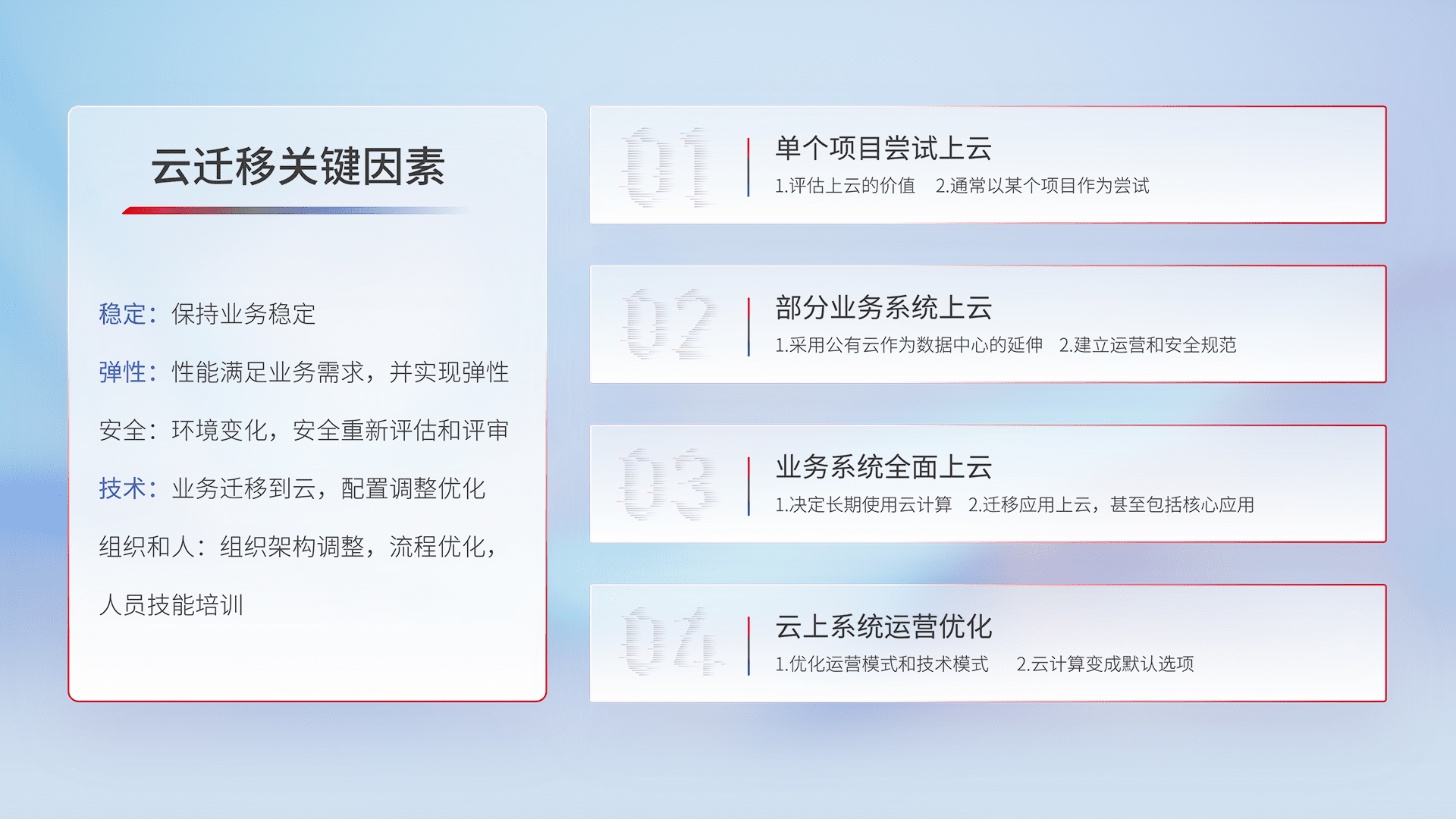 结合实际业务,,,,从规划设计、、、、云平台选型、、、、云原生改造、、数据迁移、、集成交付,,迁移全过程为客户识别最佳上云路径,,,做好风险识别管理,,设计网络架构、、身份权限、、、安全审计合规、、、、操作审计、、、日志审计、、、、监控告警策略、、、多站点容灾设计等,,,,对云上基础设施进行整体规划,,提升IT治理水平,,以满足弹性、、高可用、、、高性能的需求。。。。
