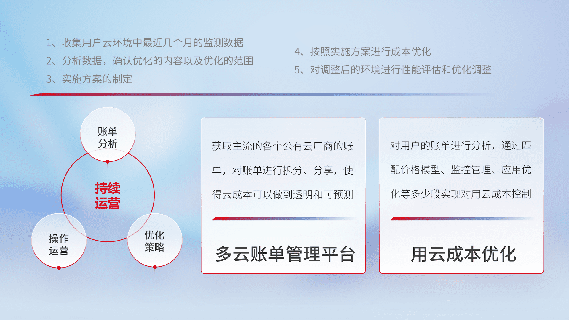 通过多云纳管,,,,以统一的资源数据模型把客户的云资源进行抽象和封装,,,,进而实现对多云资源的统一操作,,,保障云资源管理的可靠性、、稳定性与可用性。。。。量身定制化运维内容,,,配置、、、开发运维、、补丁管理、、、、备份、、、监控、、认证和访问管理、、、审计和日常巡检等,,,保障在用云过程中的可靠度,,,,稳定度以及高可用率。。