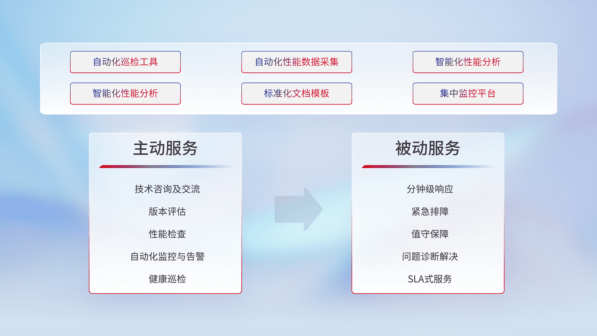 智能化工具和标准化文档,,,保障服务质量,,提供主动服务(包含技术咨询、、、版本评估、、、性能检查、、、自动化监控与告警、、健康巡检)和被动服务包含(分钟级响应、、紧急排障、、、值守保障、、问题诊断解决、、SLA服务)。。。。